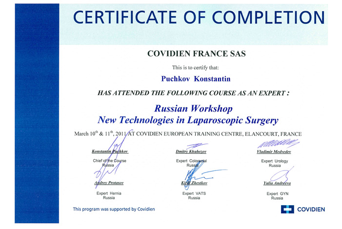 - Una clase magistral de 3 días dedicada a las tecnologías más recientes en la cirugía colorrectal, urología y ginecología fue realizada en los días del 1 al 3 de abril de 2013 en Shanghai (China), en el mayor centro de formación del mundo de la sociedad de COVIDIEN (Suiza) con el apoyo de la representación rusa de COVIDIEN. -